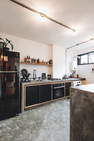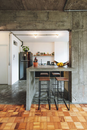 para garantir a estética industrial, lajes descascadas, bancadas e cubas de concreto, eletrodutos metálicos aparentes e cimento. Esses elementos, associados à marcenaria delicada e funcional, resultou em um apartamento confortável, repleto de luz natural e com ambientes totalmente integrados.